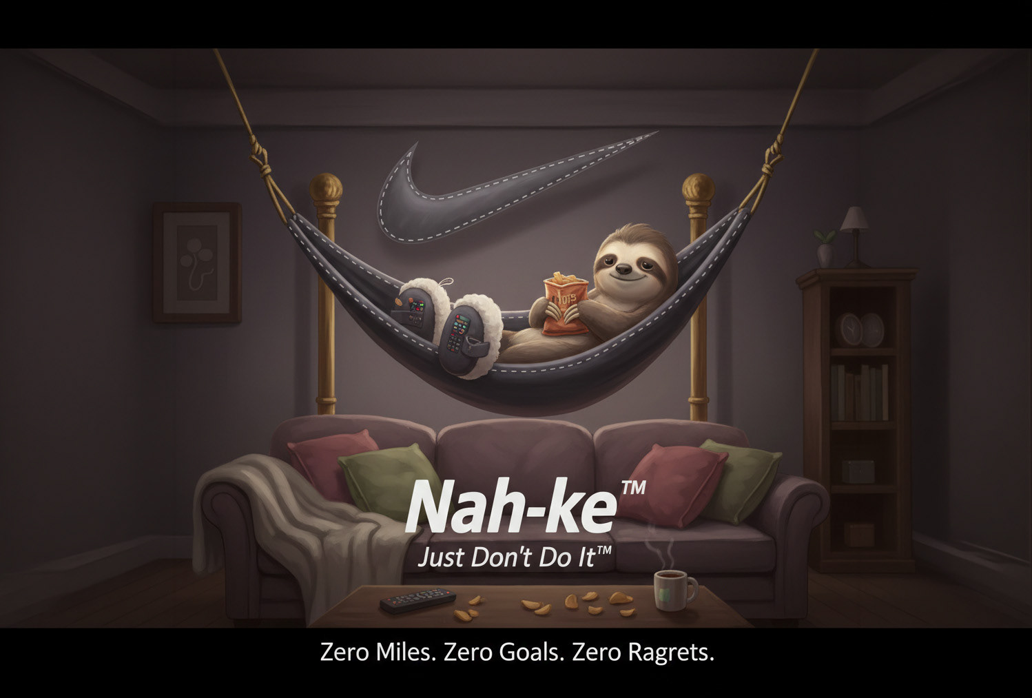 Product: "Couch Kicks" - The world's least athletic shoe, but also SOOO comfy. Scientifically designed to reduce steps by 50% (now with built-in TV remote holder).