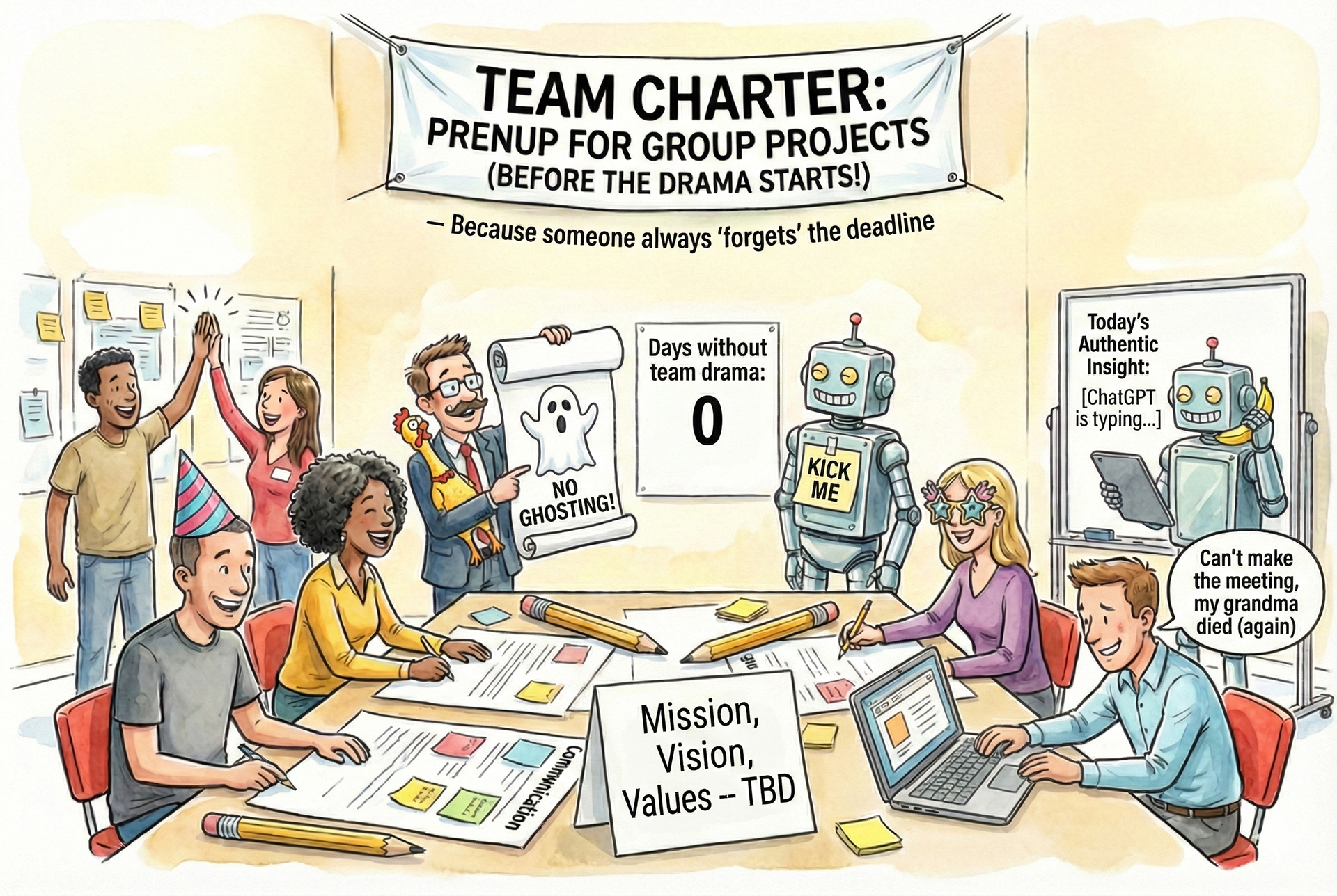 "A team charter is like a prenup for group projects - it's better to agree how you'll handle the drama before the drama starts." -- Not a Marriage Counselor, but probably should be